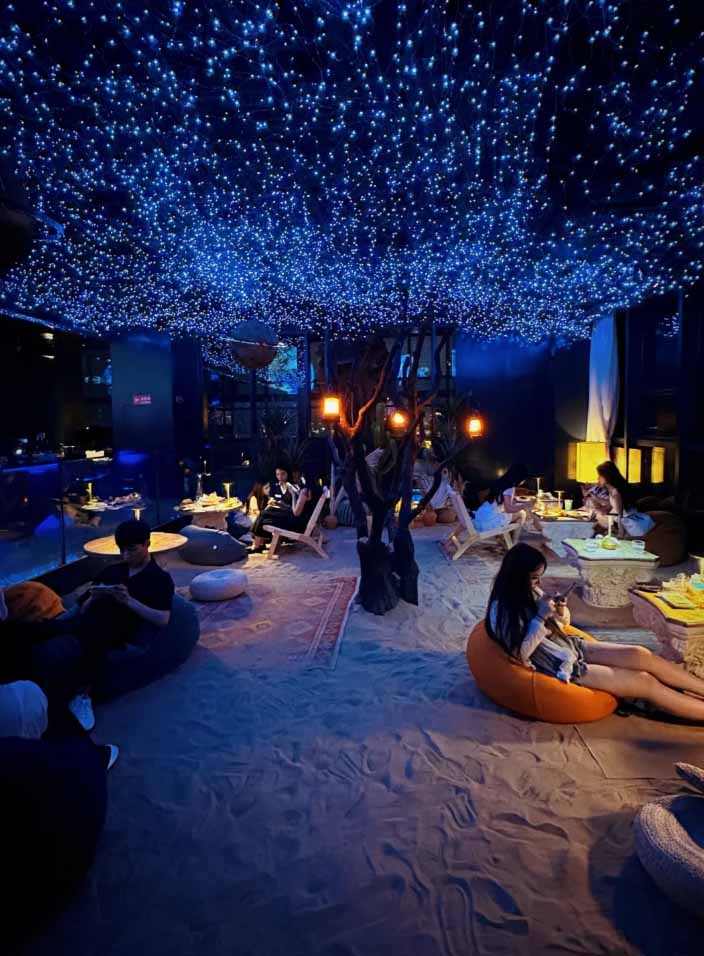 白天绝美高空下午茶有拍照打卡区,晚上是高空江景酒廊,太适合跟朋友微醺聊天了,店内很大。