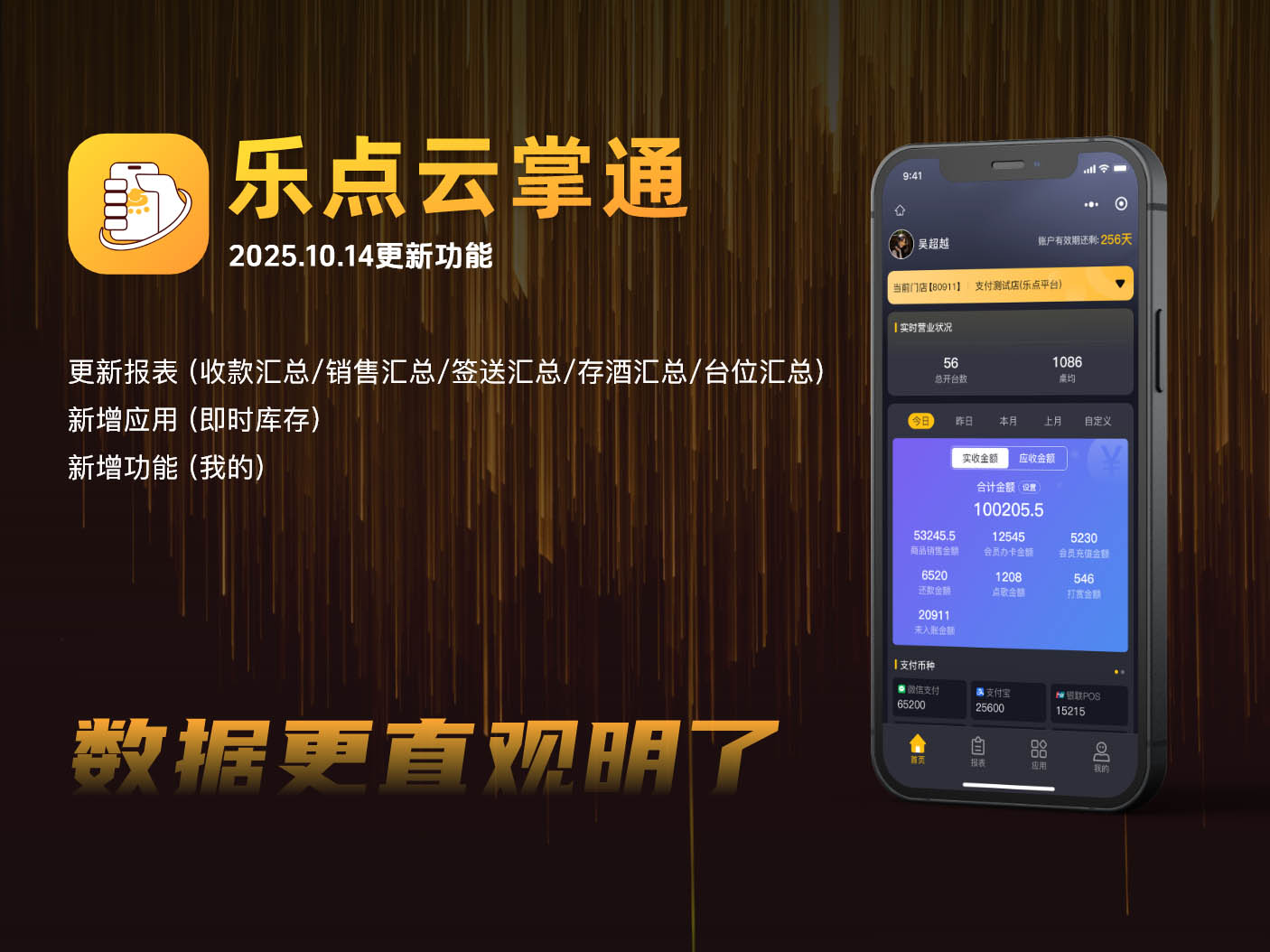 2025.10.14更新功能【乐点云掌通】报表(收款汇总,销售汇总,签送汇总,存酒汇总,台位汇总)【应用】-新增(即时库存)新增【我的】-(我的名片)