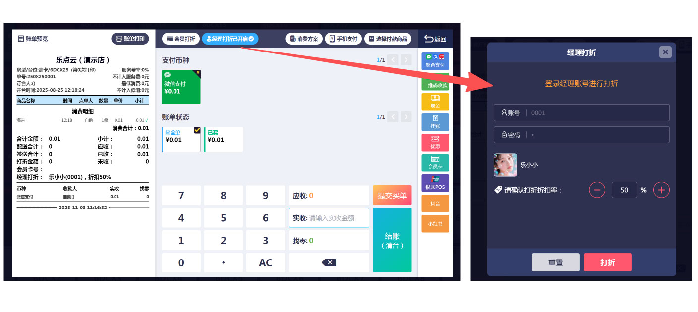 升级【会员/员工打折】,新增按折扣率打折等,台面界面显示低消差额,已开台的开台模式修改等功能