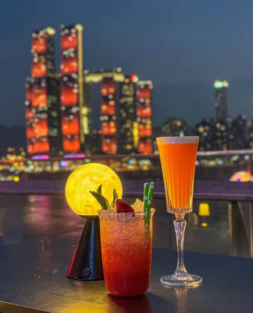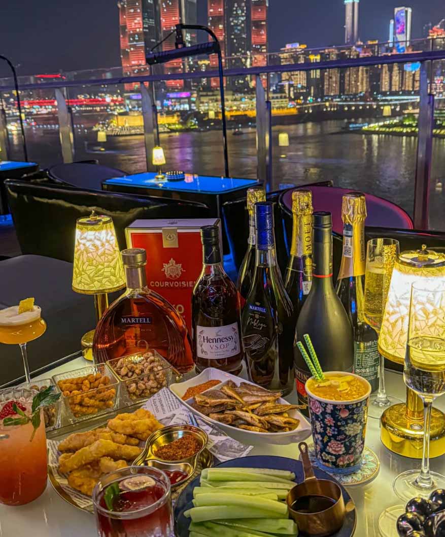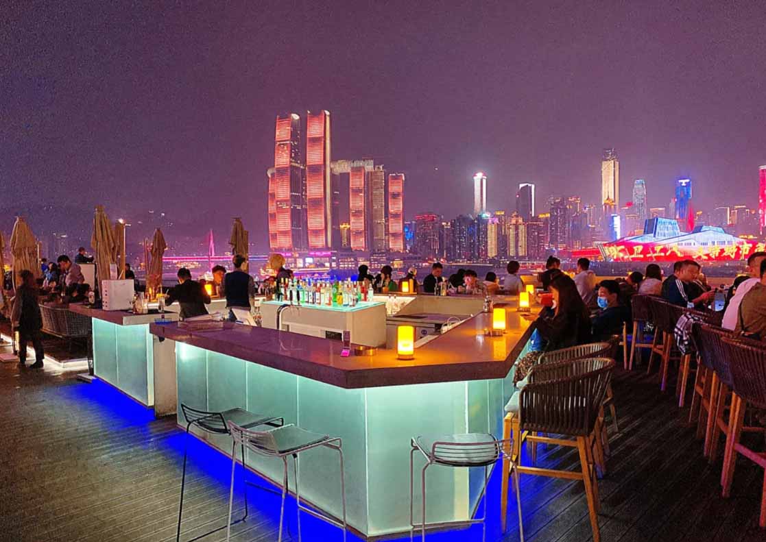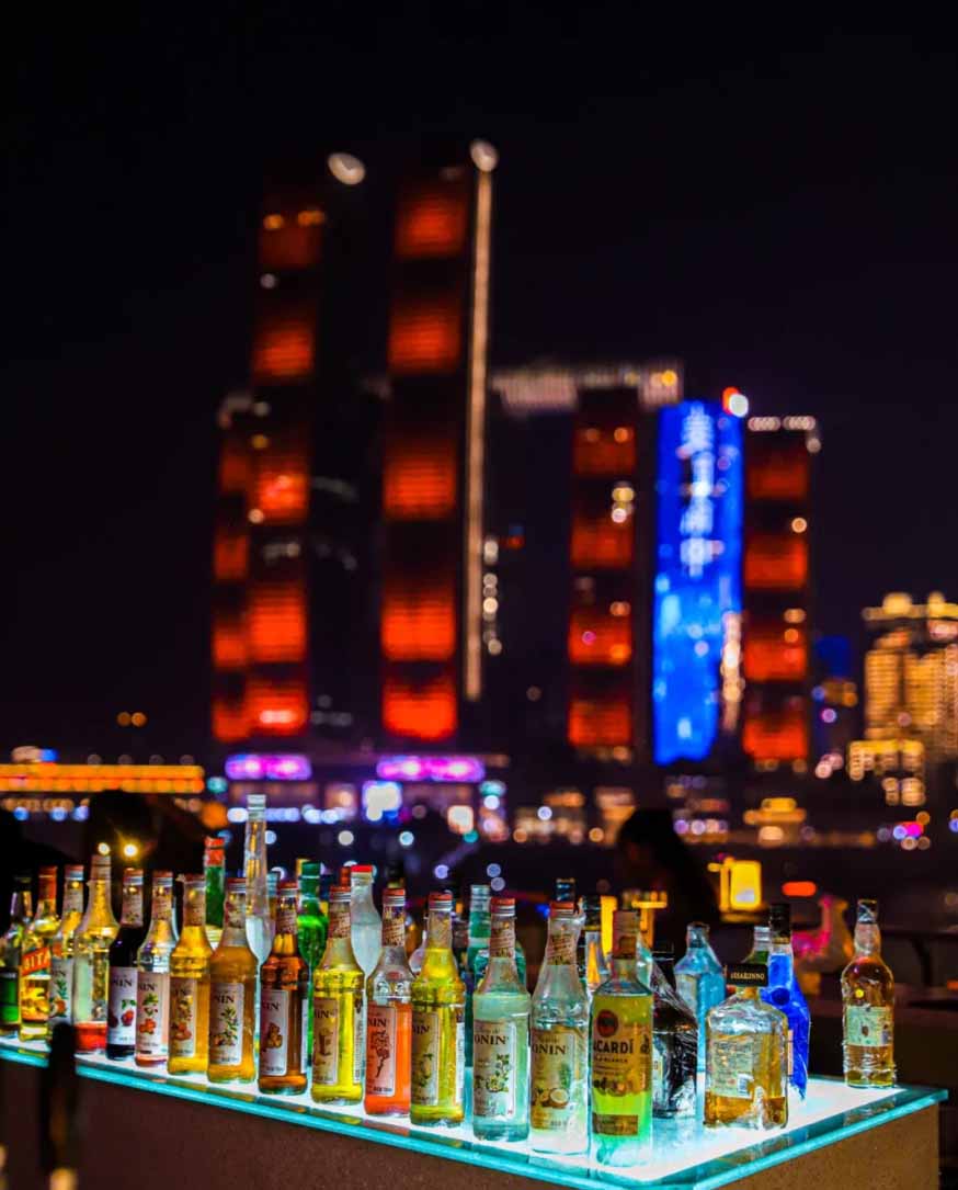 这家酒吧位于长嘉汇的露天天台上,看夜景江景的绝佳C位~晚上七点半后,来福士、千厮门大桥、大剧院……等建筑群一亮灯✨美到爆💥!!超级惊艳!!