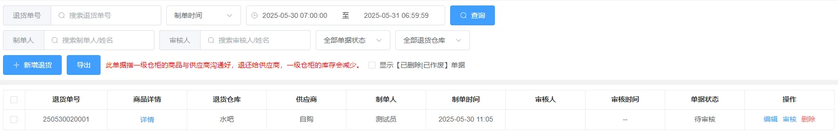 新增的退货单保存后,需要操作审核才能正式生效,退货仓柜库存数减少。